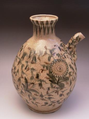 Japanese Edo Period KARATSU ware SAKE serving urn. The urn has a short neck and spout. The urn is of ovoid form and is done in an unusual floral motif, green and brown floral and leaf pattern on a gray background. The urn measures 12 1/8" tall. The urn has a repair at the neck. |