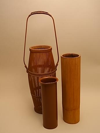 Japanese mid 20th century bamboo flower basket by master basket maker, KOSUGE KOUGETSU. The baskets comes with copper lined Otoshi, or water container. The basket measures 17 1/2" tall by 6" wide and 4 3/4" deep. (nodene) |