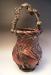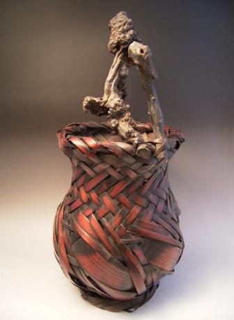 Japanese early 20th century bamboo flower basket. The basket is of large vase form with natural root handle. The basket is woven with wide and extra wide strips of dark tan colored bamboo. Unsigned. The basket measures 21" tall, 10" wide at the widest and 9" in diameter at the top. (runesu) |