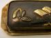 Japanese circa 1900 MAEKANAGU of a nobleman's possessions. The MAEKANAGU opens up to show an erotic scene of this nobleman and his lover. The MAEKANAGU measures 2 1/2" wide by 7/8" tall by 1/4" thick. (kune) |