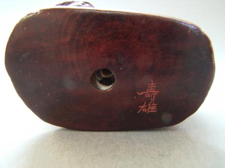 Japanese carved wooden NETSUKE. A boy, playing a flute, while riding on an ox is beautifully carved of boxwood. Signed by artist, SHUYU. 1 1/2" height, 1 1/2" width by 7/8" depth. |
