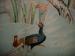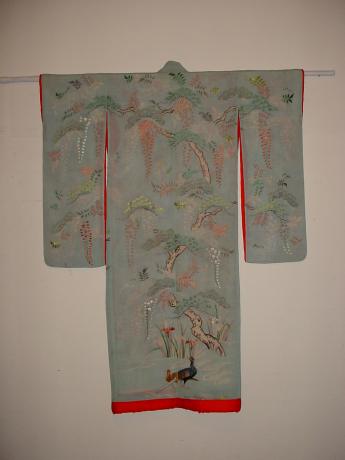 Japanese Mid 19th century pale blue embroidered FURISODE KIMONO. Design is of pine tree, wisteria, irises, pheasants, rocks and water. It measures 45" across, 61" long, with a body width of 24". (dorusu) |