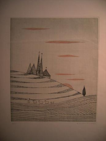 Japanese print by artist Keiko Minami. The print is of a church on a hillside with the sun setting in the background. There is a shepherd with 3 sheep and his dog in the foreground. Numbered 2 of 50. Signed in pencil in the lower right hand corner, Keiko Minami. The paper measures 15" wide by 20 1/4" tall. The print measures 11 1/4" wide by 13 1/2" tall. |