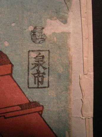Japanese Edo Period woodblock prints (2) by Kunisada. The two panels of prints in KAKEMONO form, one on top of the other, are of a war scene. Each panel measures about 10 1/4" wide by 14 1/4" tall. Insect damage to both pieces. |