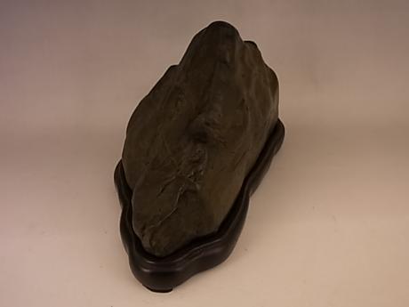 Japanese 20th century viewing stone on custom wooden stand. The natural stone has a form that resembles a miniature island formation. The stone is natural and the stand was custom made for the stone sometime in the 20th century. The stone and stand measure 5" tall, 8 1/2" wide and 4 1/2" deep. (dokasu) |