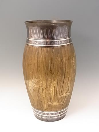 Japanese early 20th (1936) century bronze vase by artist MATSUBARA HARUO (1907-1982). He was an artist that had his works of art at all the major exhibitions, such as SHINBUNTEN, NITTEN, GENZAIKOGEITEN, etc. The vase has the design of angelfish and water plants. The vase measures 13 1/2" tall by 7" in diameter. (dorunesu) |