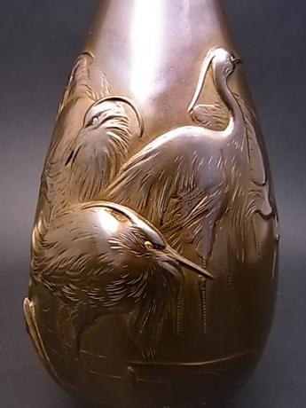 Japanese early 20th century pair of bronze vases by MIYAO. The bronze vases have the design of herons. Signed "Made by Miyao" on the bottom of each vase. The vases measure 10 1/4" tall by 4" in diameter. (kenesu) |
