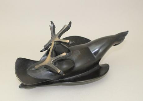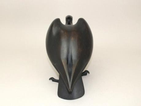 Japanese early to mid 20th century bronze eagle OKIMONO by metal artist MORIMURA TORIZOU (1897-1949). The eagle measures 10 3/4" long, 5" wide and 6 1/4" height. Morimura was born in GUNMA Prefecture. He attended the famous Tokyo Art School and graduated in 1918. He exhibited at the TEITEN exhibition in 1927 and exhibited internationally at Paris Exhibition and the San Francisco Expo. (dorunesu) |