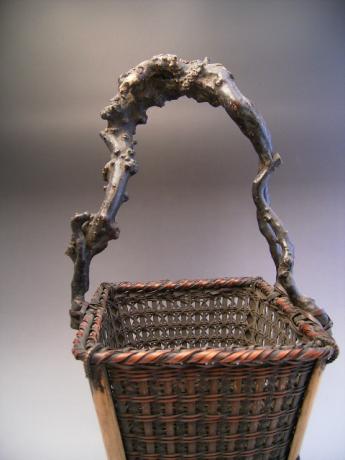 Early 20th century Japanese bamboo flower basket. Basket has mulberry tree root handle. Unsigned. 18.5" tall by 8" wide. (dokasu) |