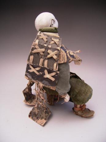 Japanese early Meiji Period Samurai doll kneeling on one knee. The head and the hands are done in a Gofun (oyster shell) finish. Great facial expression. The doll stands 9 1/2" tall and is 7" wide. |