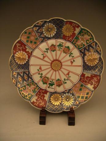 Japanese circa 1900 pair of wonderful IMARI plates. Each plate is in the shape of a chrysanthemum blossom with 16 petals. The plates are done in underglaze blue, overglaze red, green, black, brown and gold. Beautiful design of florals and geometric patterns. Design and markings in underglaze blue on back. Each plate meaasure 9 1/2" in diameter and stands 1 1/4" tall. |