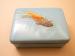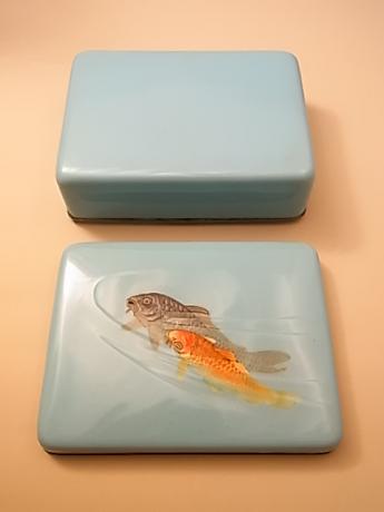 Japanese early 20th century cloisonne box with KOI design. The beautiful baby blue ground has 2 KOI done in gray and orange coloration, in a MORIAGE or raised enamel technique. The movement of the surface of the water is also beautifully shown with the surface of the top of the box. The box measures 5 1/4" wide, 4 1/16" length and 1 7/8" deep. (dokanesu) |