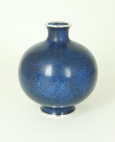 Japanese 20th century cloisonne vase by OTA HIROYUKI. OTA HIROYUKI was born in 1913 and died in 1991. The vase comes with pure silver rims marked JUN GIN, or pure silver. The vase measures 5 1/2" tall and 5" in diameter. The vase comes with TOMOBAKO, or original artist signed wooden storage box. |