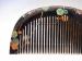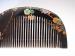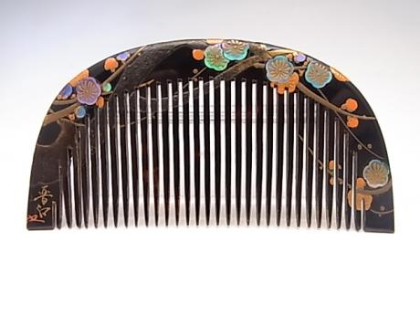 Japanese Taisho to early Showa Period comb and Kogai set. The base color is black with silver, gold and red lacquer with shell inlays. The design is plum branches and blossoms. Signed SHINKO on comb with kao and kao on kogai. The comb measures 3 5/8" wide, 1 13/16" tall and 1/8" thick. The kogai measures 6 1/16" long, 1/2" tall and 5/16" thick. (dene) |