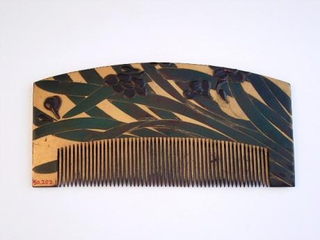 Japanese Edo Period lacquer comb with the design of daffodil done in black and gold lacquer in low and high relief. The design is done in beautiful detail and flowing form. The comb measures 5 1/4" long, 2 5/8" tall and 5/16" thick. |