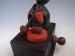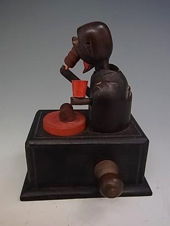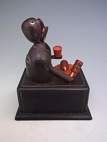Japanese early 20th century Kobe toy. This wonderful Kobe toy is eating Kushi-yaki or skewered meats while holding a meat tenderizer in his other hand. The toy measures 3" wide by 3 1/4" deep and 4" tall. (dokune) |