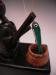 Japanese mid 20th century Kobe toy. This mechanical toy moves with the man lifting a fishing pole in one motion and pulling a fish out of a basket in the other. This piece is an artist signed piece with the artist's signature and seal on the bottom. The toy measures 2" wide, 2 1/4" deep and 7" tall (top of fishing pole). |